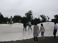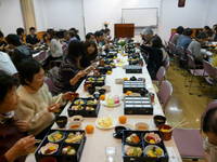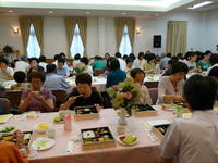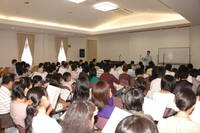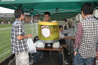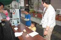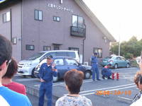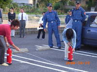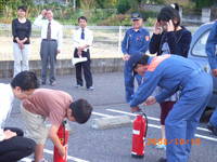 年に一度実施している消防総合訓練。 「1階台所から出火」という想定で避難訓練。消防署に119番通報し屋外へすみやかに避難。 写真は避難訓練後、消防署の指導のもと行われた水消化器を使っての消火体験訓練。