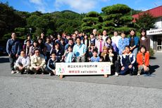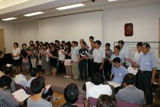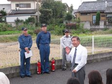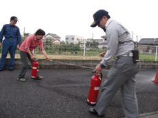 年に一度実施している消防総合訓練。 「1階食堂から出火」という想定で避難訓練。消防署に119番通報し屋外へすみやかに避難。 写真は避難訓練後、消防署の指導のもと行われた水消化器を使っての消火体験訓練。