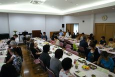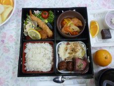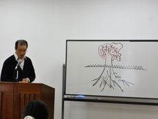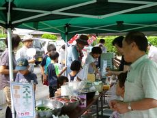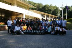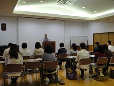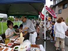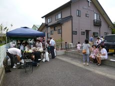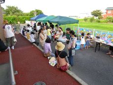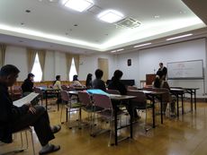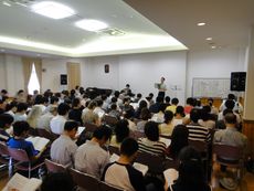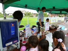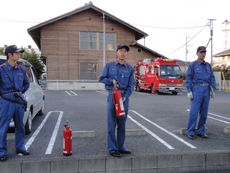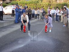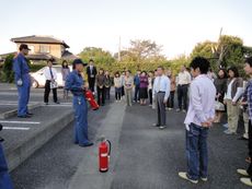 年に一度実施している消防総合訓練。 「1階食堂から出火」という想定で避難訓練。消防署に119番通報し屋外へすみやかに避難。 写真は避難訓練後、消防署の指導のもと行われた水消化器を使っての消火体験訓練。