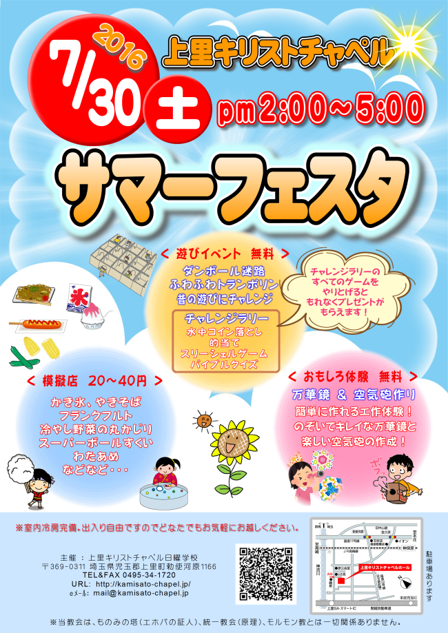 今年も猛暑の中、たくさんの人が来てくださいました。チャレンジラリー、迷路スタンプラリー、ふわふわトランポリン、かき氷、フランクフルト、焼きそば、わたあめ、冷やし野菜、スーパーボールすくい、工作…などなど盛りだくさんの内容を楽しみました!