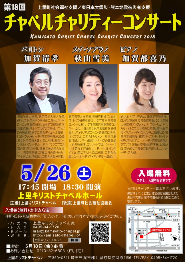 加賀清孝さん(バリトン)、秋山雪美さん(メゾ・ソプラノ)、加賀都喜乃さん(ピアノ)をお招きしてチャペルチャリティーコンサート。